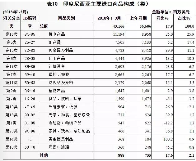 机电产品占据印尼自中国进口总额的半壁江山,1-3月进口43.9亿美元,增长23.9%,占印尼自中国进口总额的43.7%。贱金属及制品、化工产品、纺织品及原料分居进口的第二、第三和第四大类商品,1-3月的进口12.8亿美元、10.9亿美元和9.4亿美元,分别增长54.9%、25.9%和33.6%。另外塑料橡胶作为第五大进口商品,进口额为4.9亿美元,增长44.3%。在上述产品上,日本、美国、韩国和泰国等是中国的主要竞争对手。